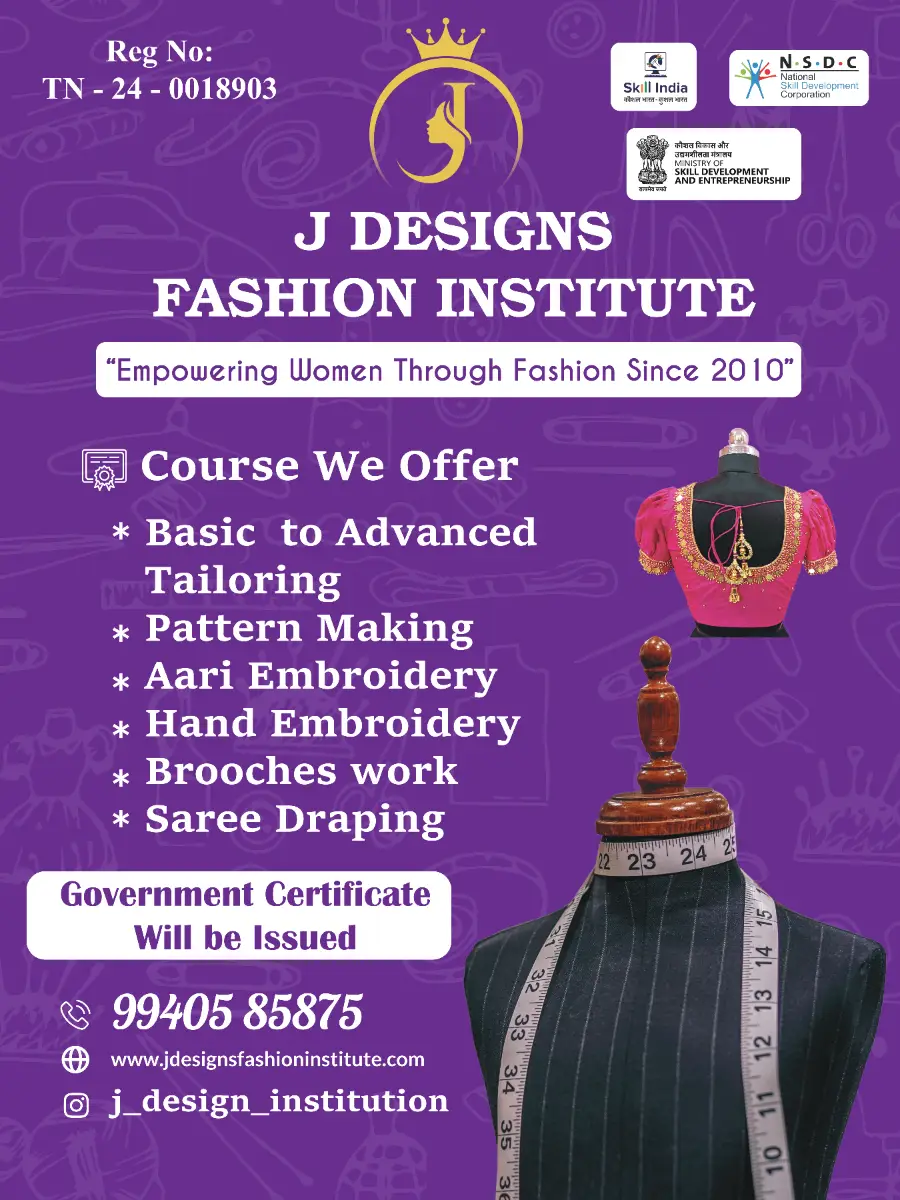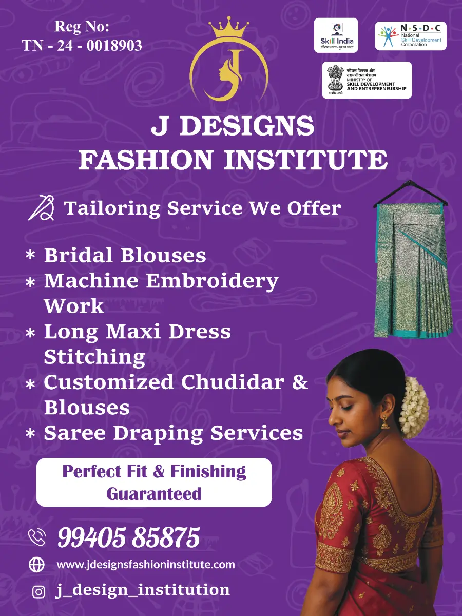 At J Designs & Fashion Institute, we provide professional tailoring services, certified training programs, and high-quality products for aspiring women entrepreneurs.